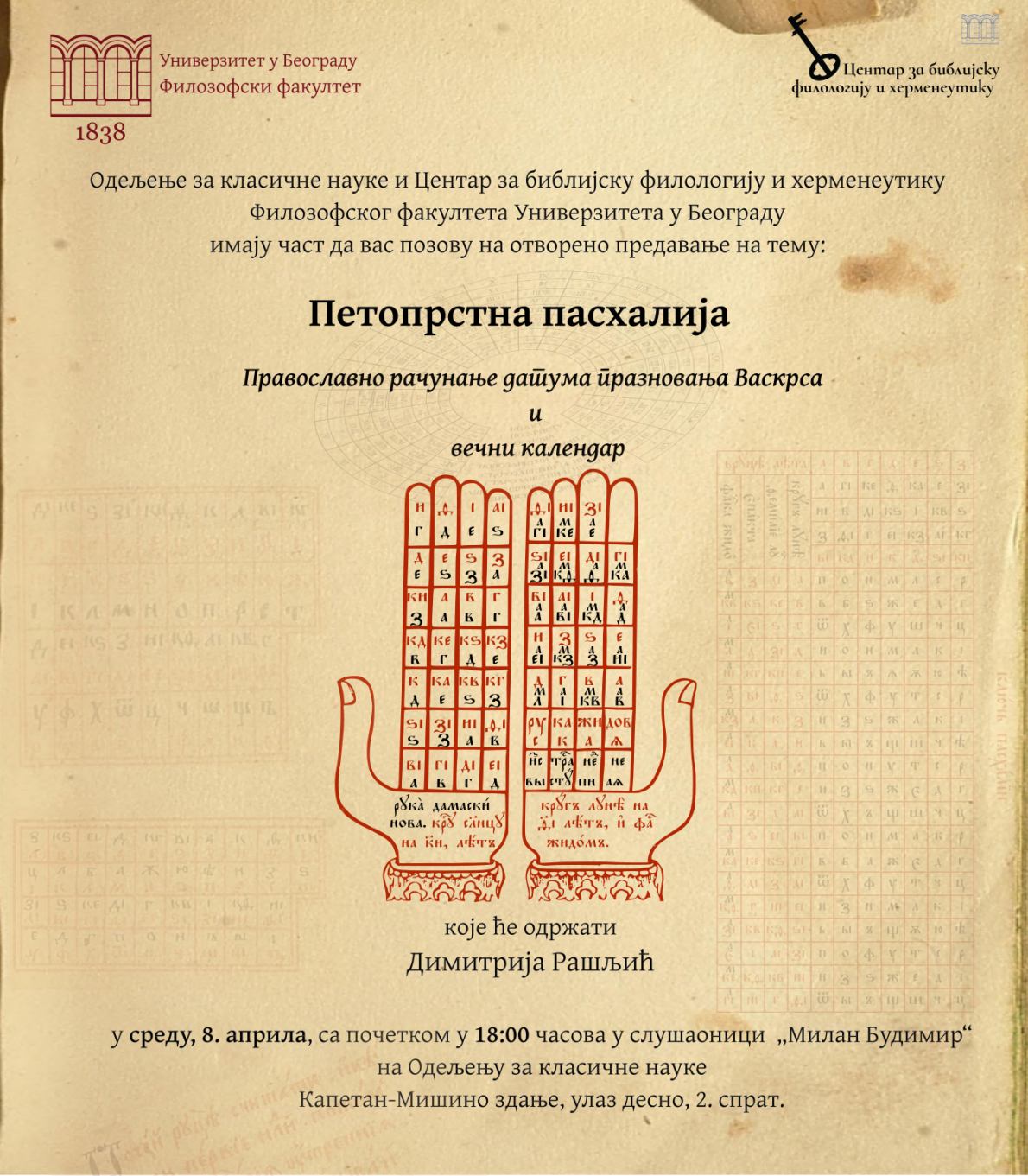 Центар за библијску филологију и херменеутику позива све заинтересоване да присуствују предавању на тему „Петопрстна пасхалија: Православно рачунање датума празновања Васкрса и вечни календар“, које ће одржати асистент Одељења за класичне науке мср Димитрија Рашљић.